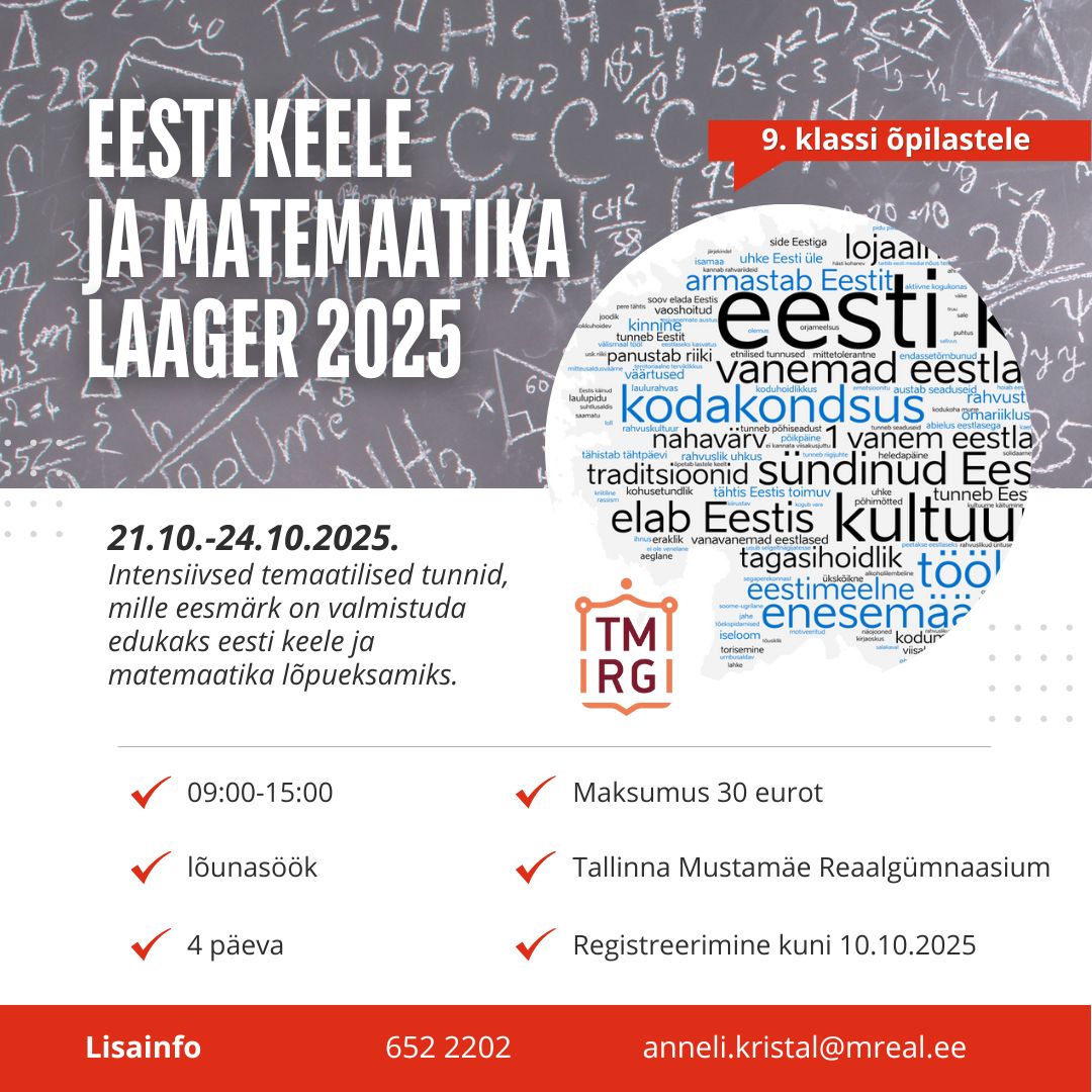 Tallinna Mustamäe Reaalgümnaasium alustab registreerimist eesti keele kui teise keele ja matemaatika lõpueksamite ettevalmistuse laagrisse enda 9.klasside õpilastele, mis toimub koolivaheajal ajavahemikul 21.10-24.10.2025. Kursuse osavõtjatele toimuvad intensiivsed eesti keelele ja matemaatikale suunatud temaatilised tunnid. Õppimise protsessis pööratakse suuremat tähelepanu suulise kõne arendamisele ja lõpueksamite ülesannete täitmisele ning vigade analüüsile.